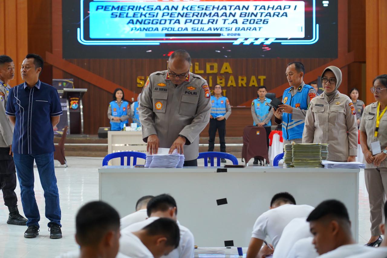 Polda Sulbar – Kepala Kepolisian Daerah Sulawesi Barat, Irjen Pol Adi Deriyan Jayamarta, melakukan pemantauan langsung kegiatan tes kesehatan dalam rangka seleksi rekrutmen anggota Polri yang berlangsung di Aula Marannu Mapolda Sulbar, Kamis (16/4/26).